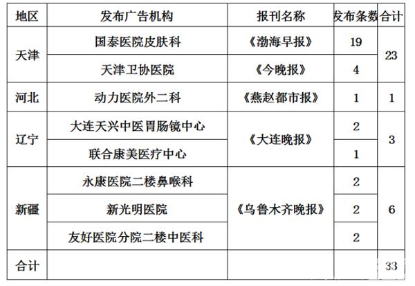 其中天津發(fā)布虛假違法中醫(yī)醫(yī)療廣告情況較為嚴重,國泰醫(yī)院皮膚科在《渤海早報》發(fā)布19條次,天津衛(wèi)協(xié)醫(yī)院在《今晚報》發(fā)布4條次。河北省的動力醫(yī)院外二科在《燕趙都市報》發(fā)布1條次。遼寧省的大連天興中醫(yī)胃腸鏡中心和聯(lián)合康美醫(yī)療中心在《大連晚報》分別發(fā)布2條次、1條次。新疆維吾爾自治區(qū)的永康醫(yī)院二樓鼻喉科、新光明醫(yī)院、友好醫(yī)院分院二樓中醫(yī)科在《烏魯木齊晚報》各發(fā)布2條次。具體名單見下: