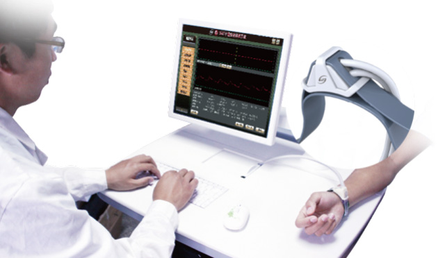 中醫(yī)脈象診斷系統(tǒng):利用計(jì)算機(jī),通過(guò)袖帶式傳感器,傳感器自身重量≤50克,在橈動(dòng)脈寸,關(guān),尺三個(gè)部位檢測(cè)脈象信號(hào),模仿中醫(yī)醫(yī)師指法,(傳感器Φ8圓形)更準(zhǔn)確的按照中醫(yī)舉、按、尋的診脈過(guò)程,浮、中、沉散布全自動(dòng)氣體加壓取脈,采集八個(gè)不同壓力段的脈象波形自助選擇佳壓力波形,并將脈象的位,數(shù),形,勢(shì)和脈圖的各項(xiàng)參數(shù)自動(dòng)分析,以判定脈象信息,用于臨床脈象檢測(cè)。